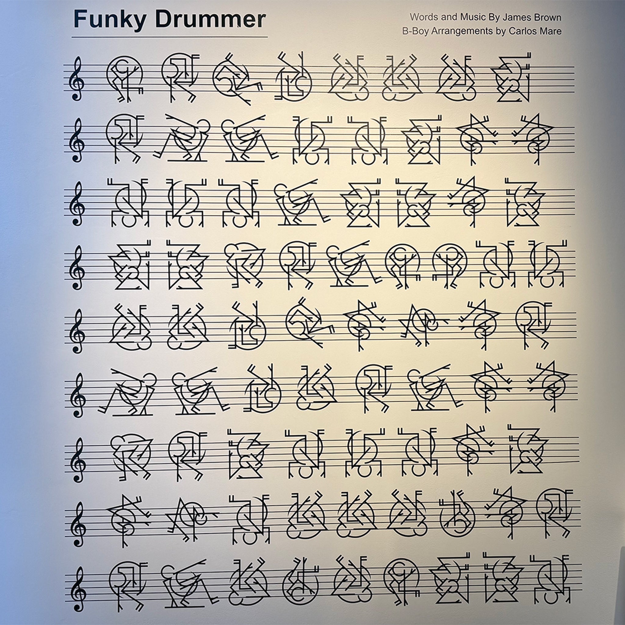 In this design, each icon serves as both musical notation and a specific movement, allowing one to visualize Clyde Stubblefield’s drum patterns playing on their chest. Every symbol represents an actual move, including head spins, back spins, the 6-step, and freezes.